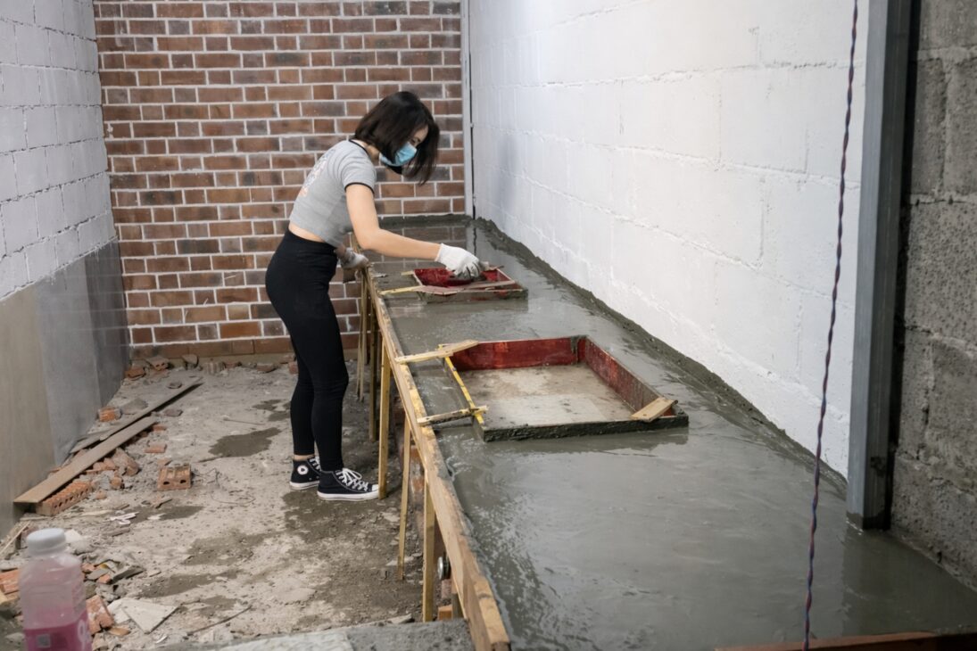 Utiliza formas de madera para sostener el concreto, aplica, por lo tanto, con llana y corrige la superficie en movimientos cortos. Recortes grandes ya emergen bien marcados, pensados para encajar los módulos correctos, como fregadero y área de cocción.