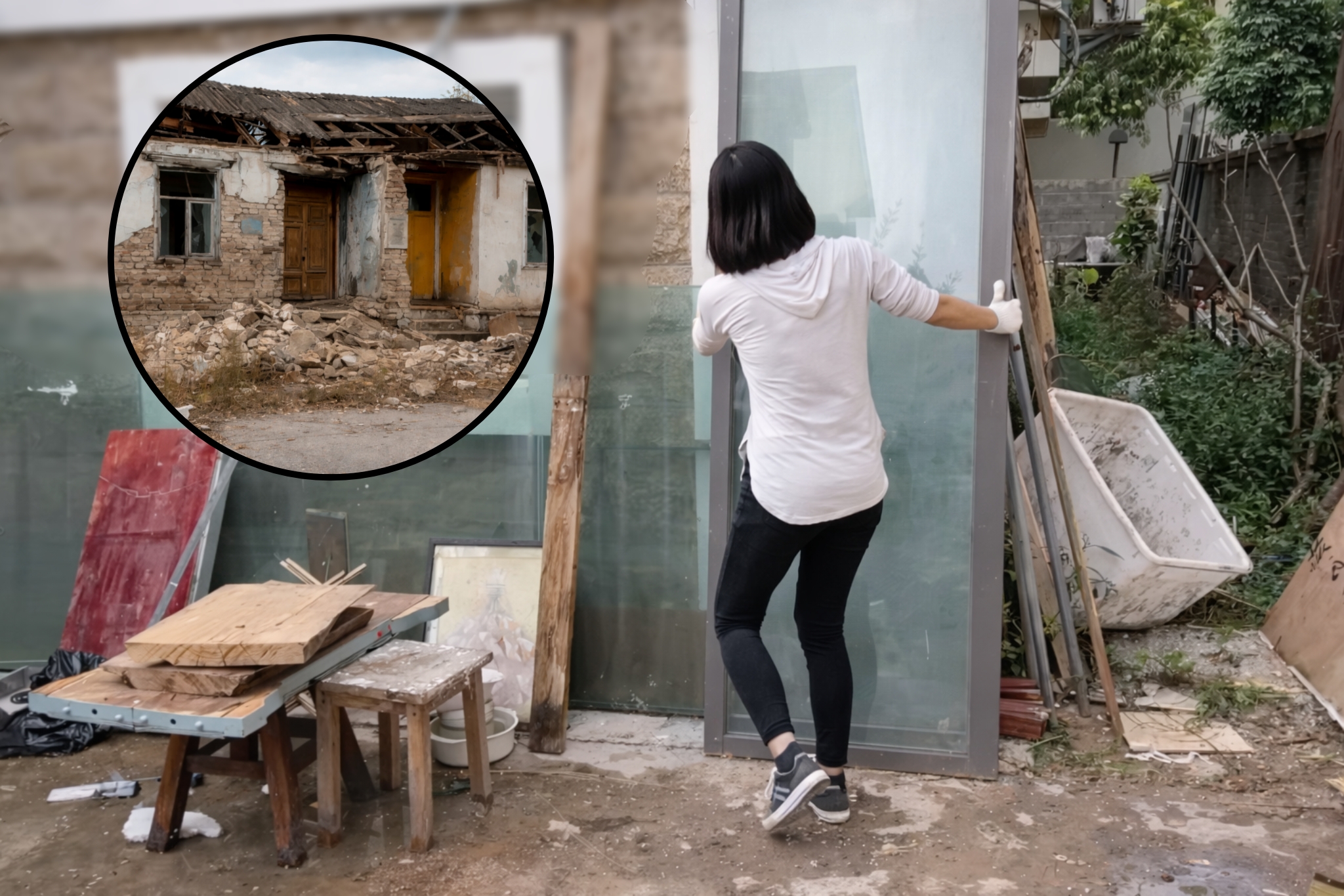 La historia comienza como muchas personas se rendirían: una mujer, con una casa antigua en manos, llena de escombros y suciedad, decide llevar a cabo la reforma sola y no retrocede. El primer escenario está bloqueado por neumáticos, tablones, cubos y piezas metálicas esparcidas. El final aparece limpio, organizado y listo para usar, con un banco continuo, fregadero doble, ladrillo en la pared y una terraza clara con asiento y jardineras.