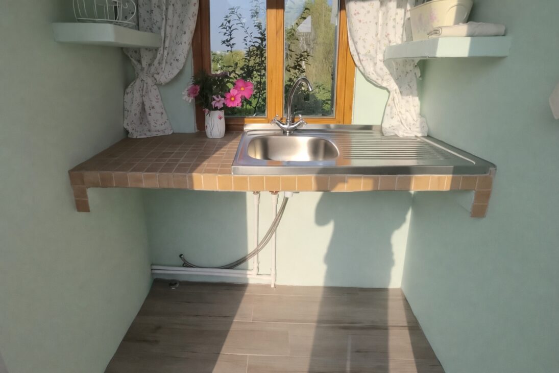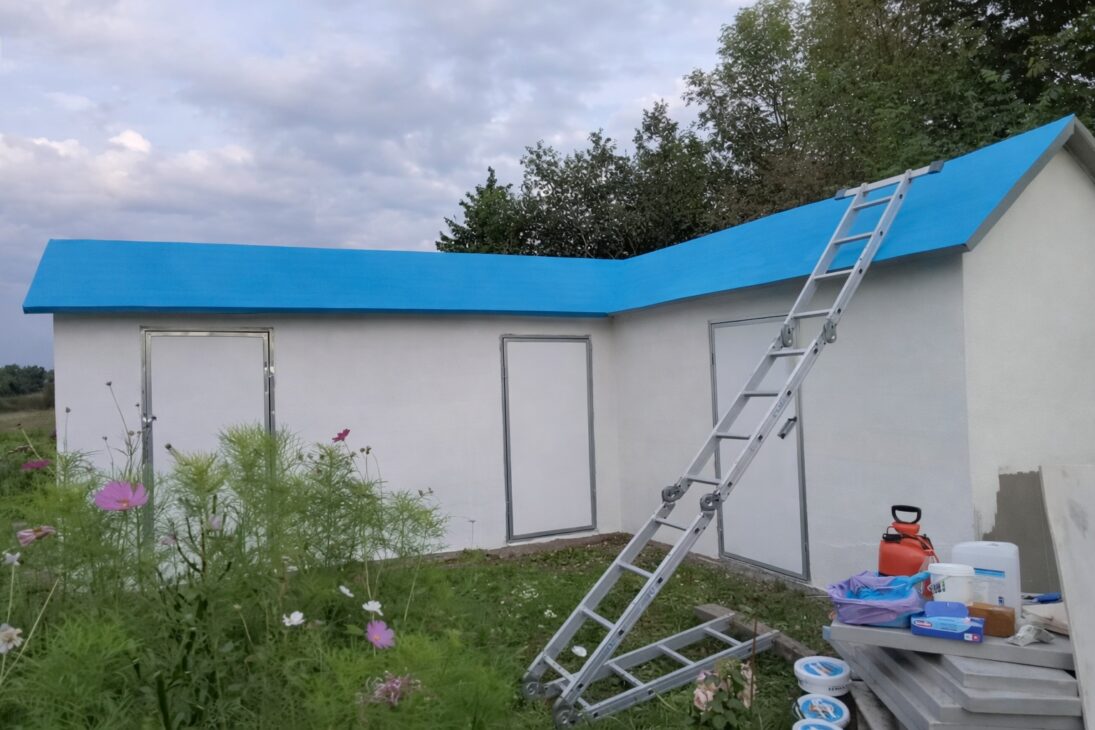 Internamente, las paredes fueron enlucidas y alisadas. El baño ganó una capa extra de protección contra la humedad. La pintura utilizada fue pintura exterior a base de agua, compatible con superficies de espuma y yeso, ofreciendo protección adicional contra intempéries.