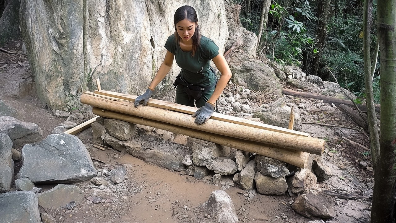 A continuación, la construcción avanza a una etapa que revela un conocimiento técnico poco intuitivo. Utilizando bambú y madera, ella monta una trampa estructural en el interior del agujero. Varas gruesas son encajadas en los bordes, creando un perímetro rígido.