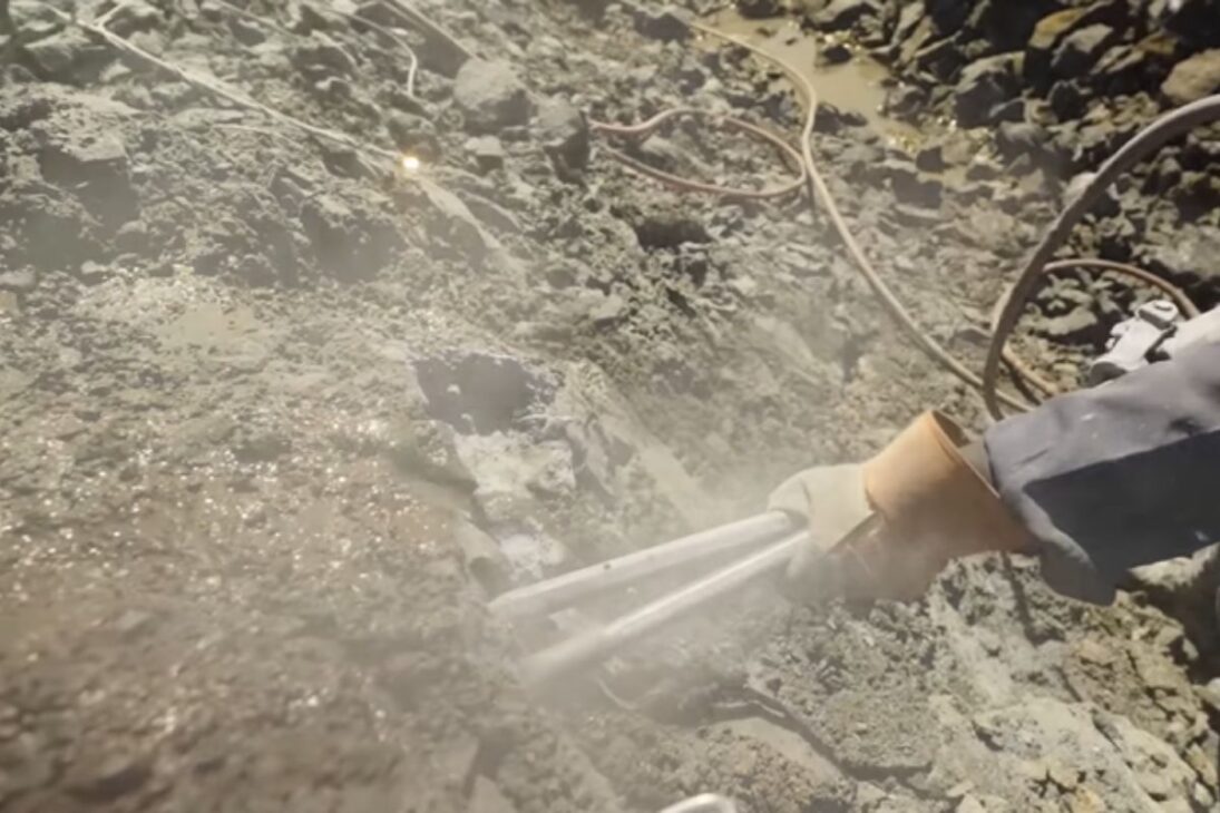 Explosiones controladas abren camino a través de las capas de basalto, y los mineros identifican pequeñas fisuras que indican la presencia de una cavidad con cristales.