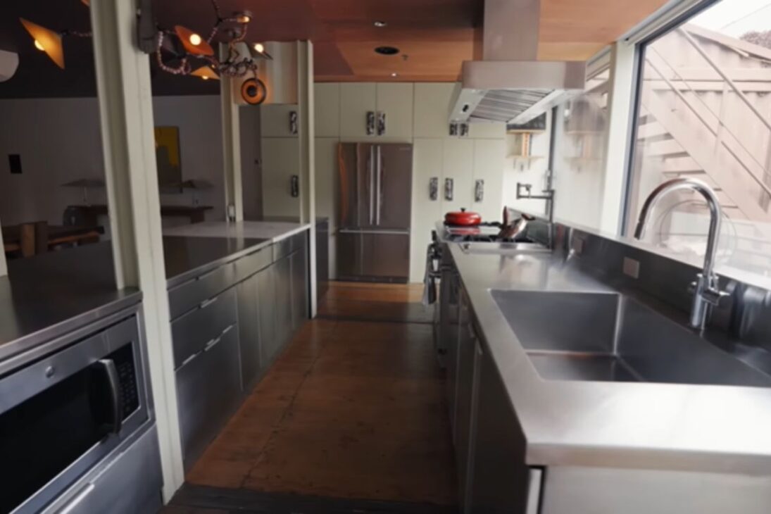La organización interna combina utilidad y teatralidad. La cocina enteramente en acero inoxidable, producida por una empresa acostumbrada a cocinas profesionales, refuerza la vocación técnica de la casa y dialoga con el origen industrial de los contenedores. Al mismo tiempo, el acabado fue integrado al espacio social para funcionar como escena abierta de convivencia, no como área aislada de servicio.