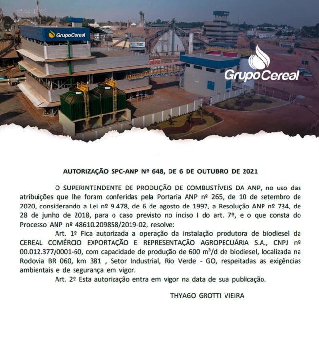 La Agencia Nacional del Petróleo, Gas Natural y Biocombustibles (ANP) autorizó al Grupo Cereal a iniciar la operación de una Planta de Biodiésel en la ciudad de Rio Verde, en el estado de Goiás, respetando todas las exigencias ambientales previstas en la legislación brasileña. La decisión fue publicada el día 06 de octubre de 2021. Consulta también esta noticia: Mato Grosso cuenta con el mayor número de plantas de biodiésel en operación del país. Estado posee 17 unidades en gran producción