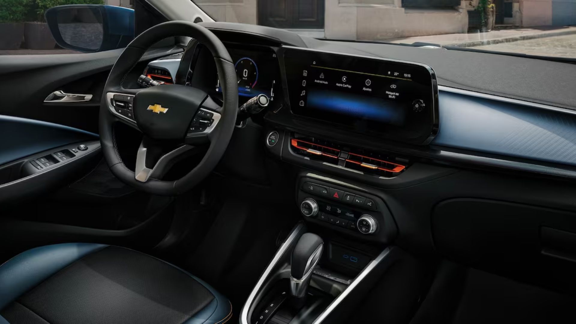 Chevrolet adopta asientos y detalles del panel en negro y azul, combinados con salidas de aire naranja.