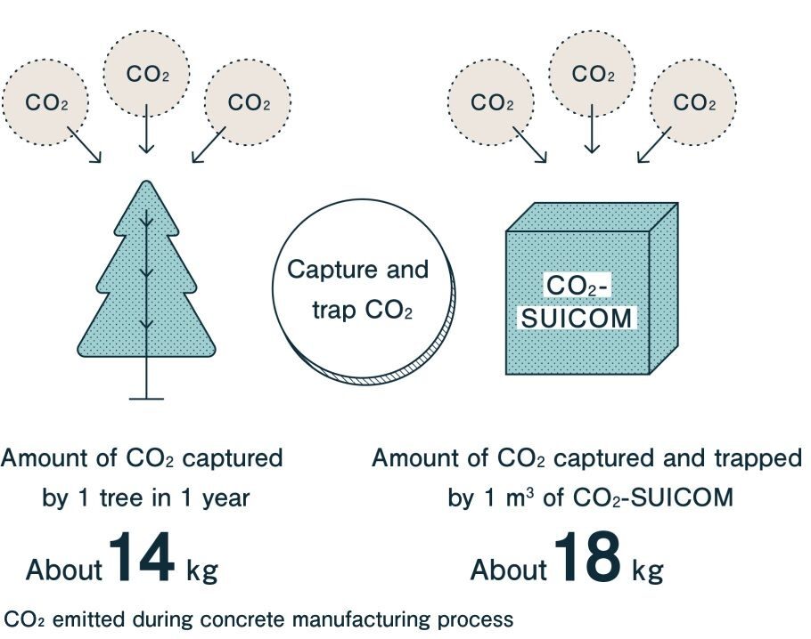 De acuerdo con estimaciones, Japón consume anualmente 91 millones de metros cúbicos de concreto. Si esta cantidad fuera sustituida por el CO2-SUICOM, sería posible reducir en 27,84 millones de toneladas las emisiones de carbono. Este volumen equivale a aproximadamente un tercio de la cantidad de dióxido de carbono que los bosques japoneses capturan en un año. Además, el concreto capturaría alrededor de 1,64 millones de toneladas de carbono, contribuyendo significativamente a la estrategia de neutralidad de carbono del gobierno japonés, que busca alcanzar este objetivo para 2050.