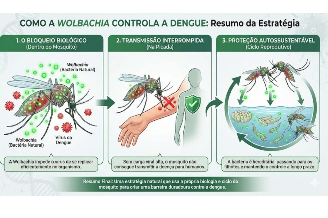 El método usa Aedes aegypti con Wolbachia para dificultar que virus de arbovirosis se desarrollen en el organismo del mosquito, reduciendo la capacidad de transmisión.