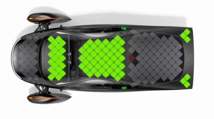 El Aptera es capaz de recargar sus baterías mientras está estacionado, ganando hasta 64 kilómetros de autonomía gratis por día en condiciones favorables.