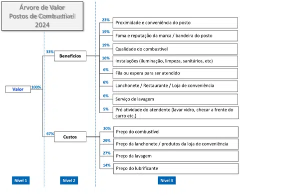 El Valor Percibido considera la relación costo-beneficio evaluada por los clientes. Entre los encuestados, los beneficios contaron un 33% en la percepción de valor, con énfasis en la ubicación (23%), reputación de la marca (19%), calidad del combustible (19%), instalaciones físicas (16%), filas (6%), tienda de conveniencia (6%), servicio de lavado (6%) y atendientes (5%). Los costos pesaron un 67%, destacándose el precio del combustible (30%), precios en la cafetería (29%), precio del lavado (27%) y precio del lubricante (14%).