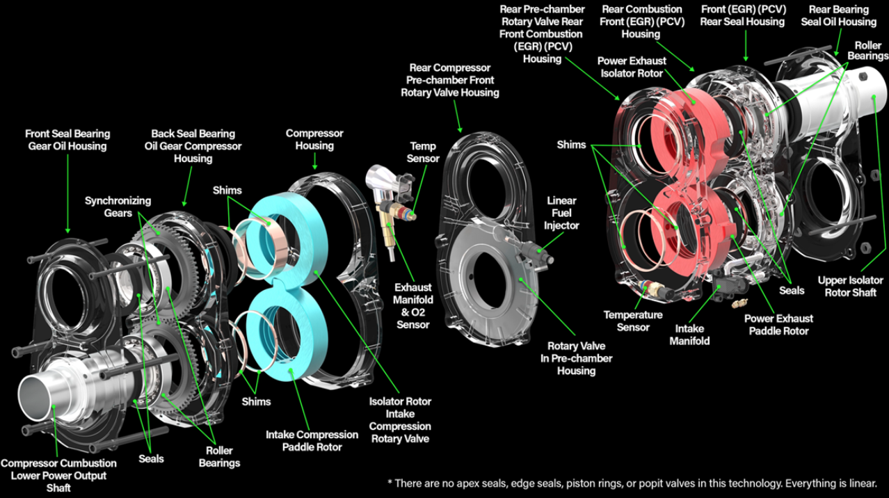 O funcionamento também é incomum: ele utiliza dois pares de rotores que operam em câmaras separadas — um par para admissão e compressão do ar, e outro para combustão e escape. Esses rotores giram em sentidos opostos com engrenagens sincronizadas, eliminando a necessidade de componentes pesados como virabrequins ou válvulas. O resultado é um conjunto altamente eficiente, compacto e com manutenção reduzida.