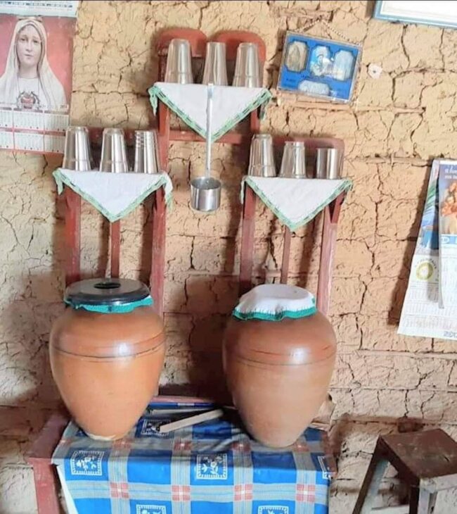 Junto al pote, se colocan vasos, tazas, cuias y mitades de cabaças, utilizados para beber. El proceso de sacar agua también tiene sus propios instrumentos tradicionales.