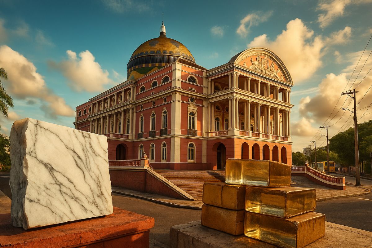 El Teatro Amazonas, en Manaus, fue construido en el apogeo del ciclo del caucho con mármol de Carrara venido de Italia, vidrios y azulejos de Francia y hierro fundido de Escocia, simbolizando la era de lujo y ambición que marcó la Amazonia a finales del siglo XIX.
