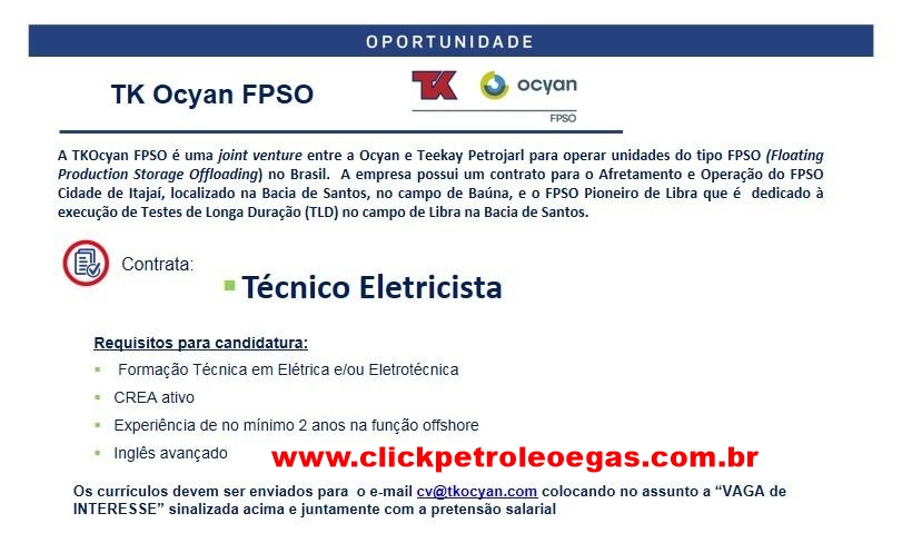 Las vacantes son para trabajar en el FPSO Cidade de Itajaí como técnico electricista, quienes cumplan con los requisitos no necesitan preocuparse por cursos de embarque