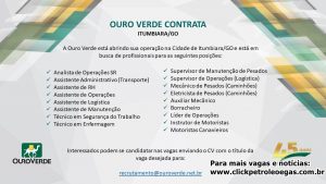 Con El Aumento De Las Operaciones Y La Instalación De Su Más Reciente Base En La Ciudad De Itumbiara – GO, La Ouro Verde Inicia Contrataciones Para 17 Cargos Diferentes