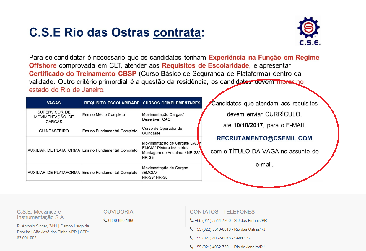 [supsystic-social-sharing id=’1′]Vacantes offshore oficiales promovidas por la CSE, empresa que ahora pertenece a Aker Solutions. Para postularse, todos deben estar al tanto de que los currículos deben ser enviados hasta el día 10 de octubre. También es obligatorio que todos tengan experiencia offshore comprobada en la función, la escolaridad debe ser equivalente a lo que se solicita, el curso de Salvamento también debe estar al día. No se permitirán candidaturas de personas que no residan en el Estado de Río de Janeiro, así que por favor, no envíen correos electrónicos si no cumplen con los criterios de las oportunidades. Vean con más detalles las atribuciones solicitadas: