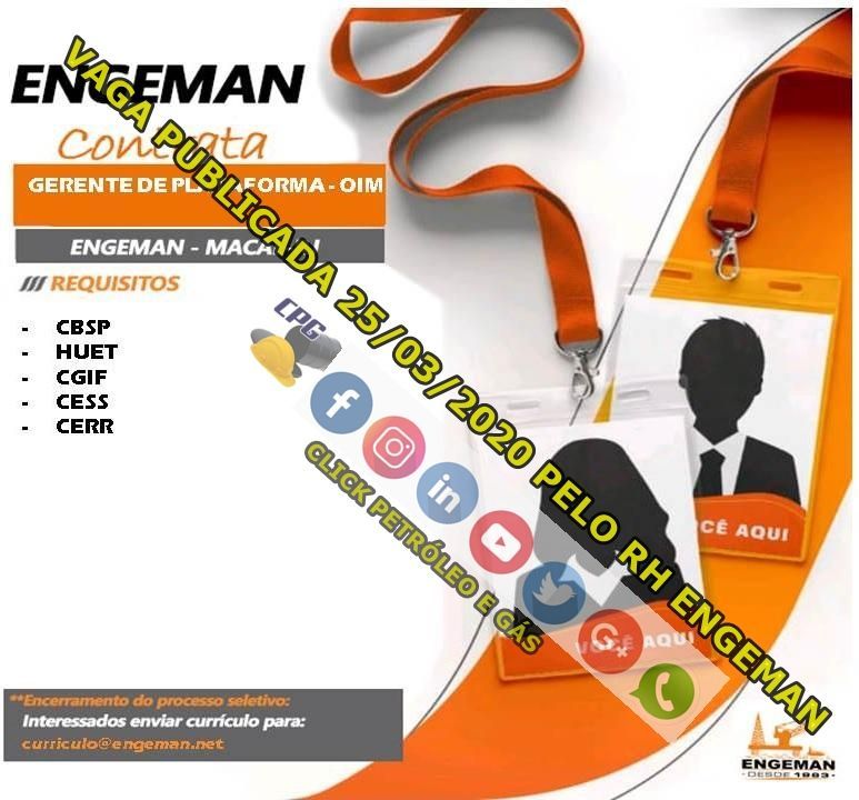 Si Eres Profesional Especializado En La Función Anterior, Residente De Macaé Y Te Interesaron Las Vagas Para Actividades Offshore De La Engeman Óleo Y Gás, Envía Tu Currículo Inmediatamente Indicando En El Título El Nombre Del Cargo Deseado Para El Correo Electrónico curriculo@engeman.net ¡Buena Suerte A Los Candidatos!
