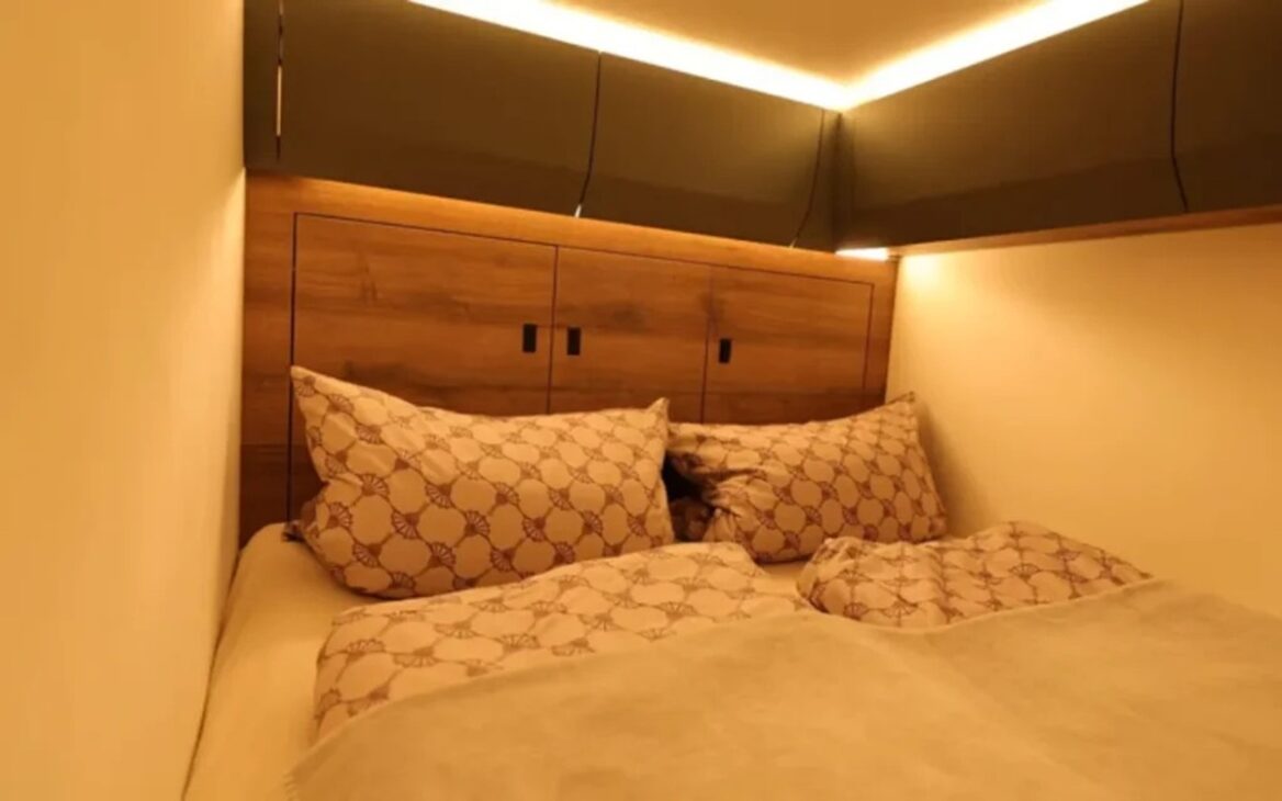 Los acabados utilizan madera noble, tapicería en cuero y armarios diseñados, alejando la idea de vida rústica. La propuesta interna fue diseñada para confort prolongado, incluso en lugares lejanos de infraestructura urbana, manteniendo altos estándares de habitabilidad.