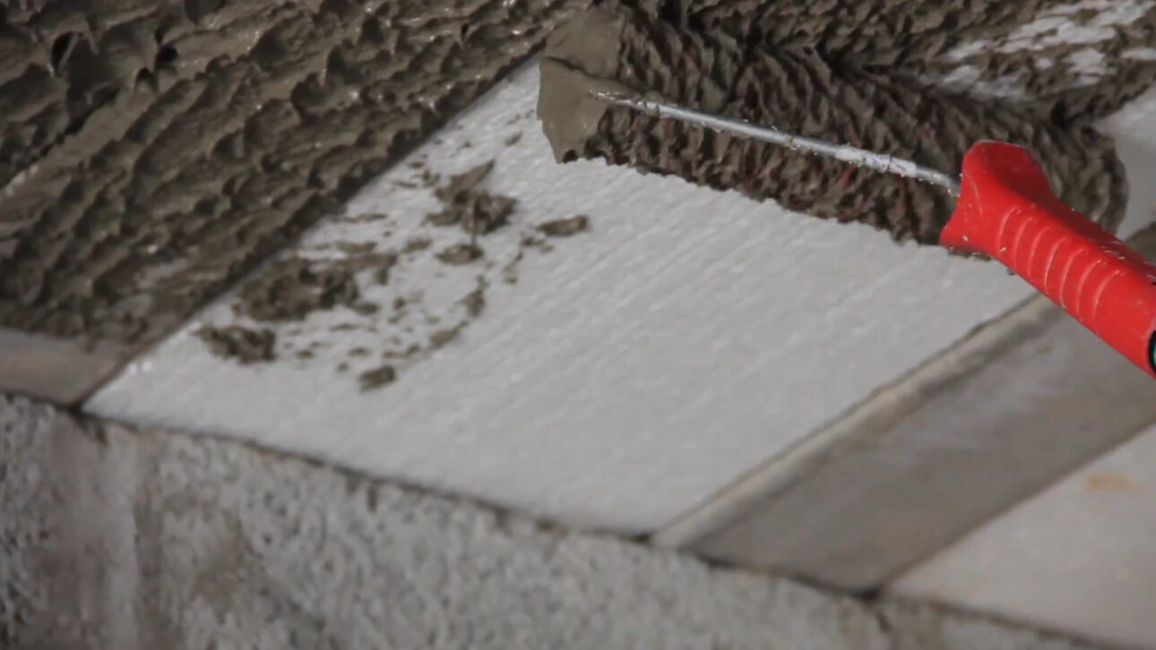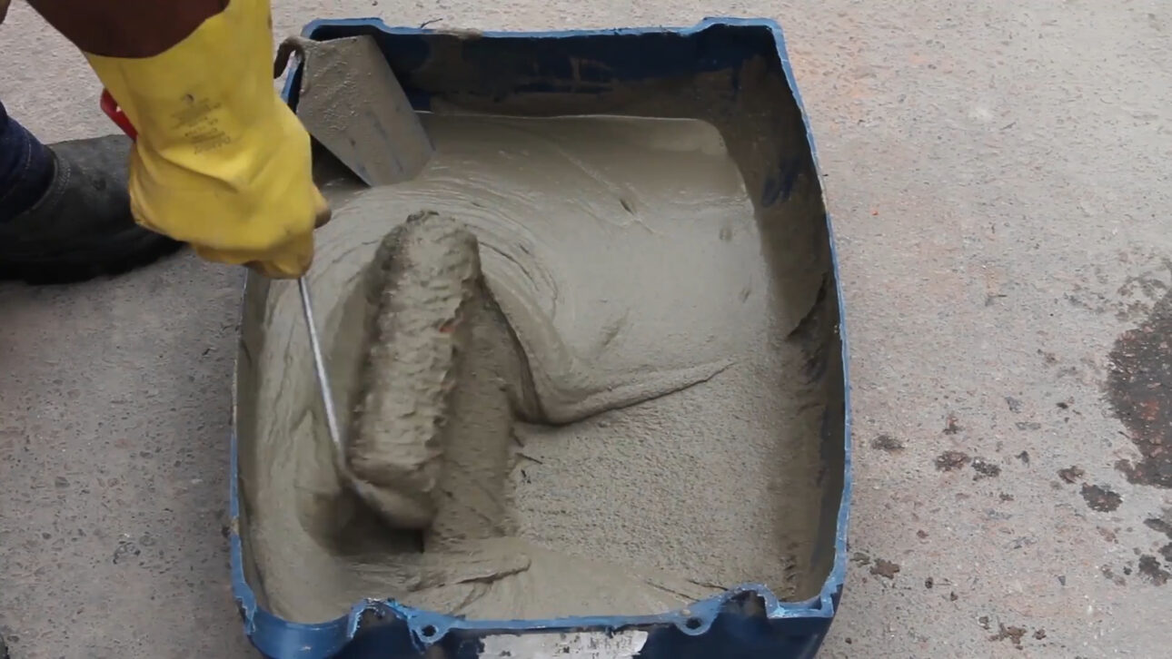 La mezcla de la argamassa con arena fina debe alcanzar una consistencia pastosa, pero no líquida. A continuación, el rodillo de espuma gruesa deposita la masa en la superficie con movimientos cruzados, creando el patrón texturizado.