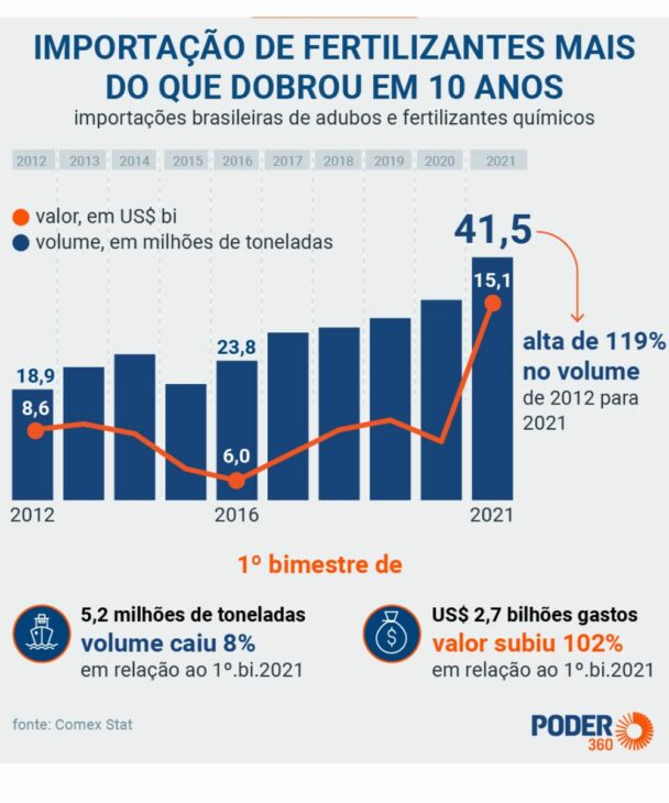 Según un levantamiento realizado por el equipo de Portal360, la importación de fertilizantes para Brasil alcanzó 41,5 millones de toneladas en 2021. Esto representa un aumento del 119% en volumen en los últimos 11 años. Consulta los datos en el gráfico a continuación.