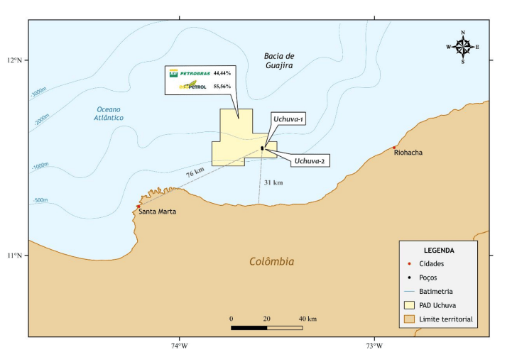 Localizado a 31 kilómetros de la costa colombiana, el pozo Uchuva-2 está a una profundidad de 804 metros. La perforación del pozo se está realizando en cinco fases, y en la cuarta fase se constató un intervalo portador de gas a través de perfiles eléctricos, que aún serán caracterizados por análisis de laboratorio.