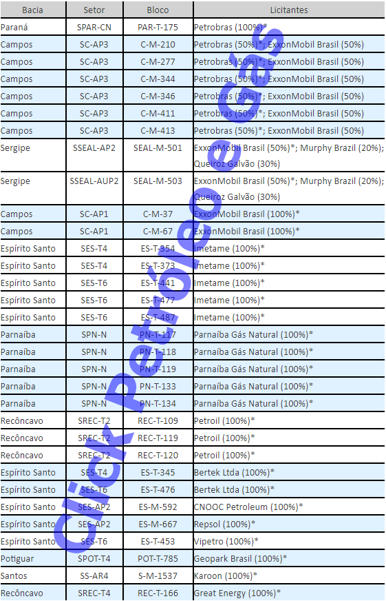 Como la Petrobras ahora no está más obligada a explorar todos los activos brasileños, muchas empresas tuvieron la oportunidad de hacer buenos negocios, y eso es precisamente lo que ocurrió. Los incentivos fiscales y la flexibilización del contenido local fueron uno de los grandes atractivos para que esto fuera posible. Para el trabajador común, esto significa que la nueva fase requerirá mucha mano de obra especializada, técnicos e ingenieros estarán en la mira, además de mover toda la industria de manera indirecta, como es el caso de la ciudad de Maricá-RJ, que experimentó un BOOM con la llegada de actividades del pre-sal en el municipio. Vean la tabla de las empresas, cuencas y sus bloques adjudicados.
