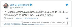 El Presidente Jair Bolsonaro Elogió Este Sábado al Presidente de Petrobras, Roberto Castello Branco, Debido a la Reducción en el Precio Medio de la Gasolina y del Diésel — Anunciada por el Propio Bolsonaro el Viernes.