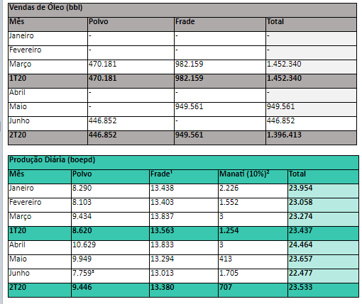 PetroRio, la mayor compañía independiente de petróleo y gas del país, publica sus Datos Operacionales preliminares de junio de 2020. Se vendieron, en el segundo trimestre, 1,4 millones de barriles (bbls) provenientes de los Campos de Polvo y Frade, que, sumados a un número similar obtenido en los primeros tres meses, resultan en 2,8 millones de bbls alcanzados en el semestre.