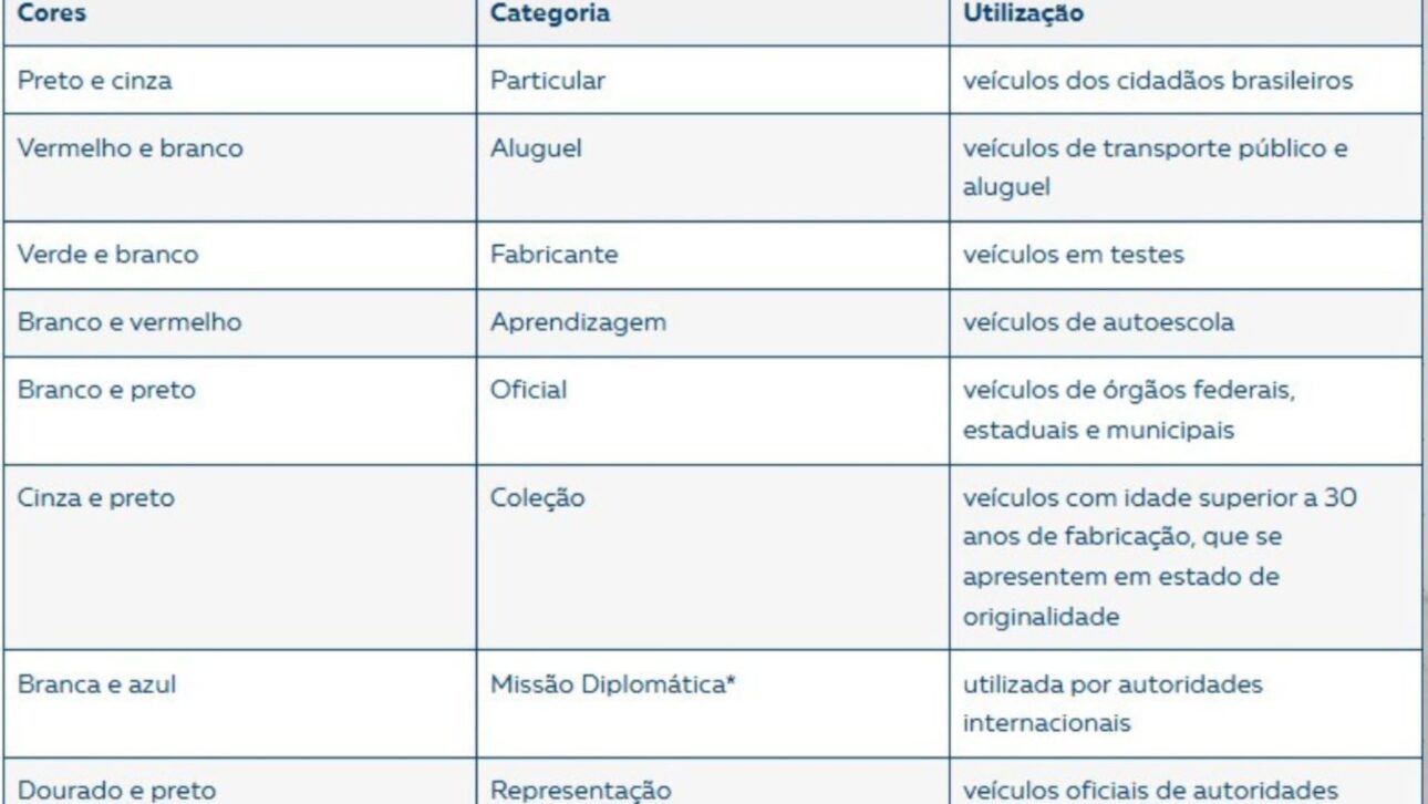Además de las reglas de obligatoriedad, muchos conductores aún tienen dudas sobre la apariencia de la placa Mercosur. Esto ocurre porque introdujo diferenciaciones importantes, principalmente en el sistema de colores, que ahora identifica categorías a través de los matices del borde y de los caracteres — a diferencia del modelo anterior, en el que fondo y letras indicaban la función del vehículo.