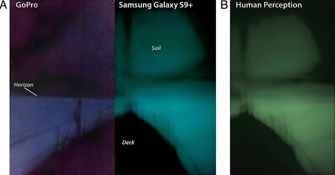 Según el relato del equipo, el mar emitía una luz verde neón uniforme que parecía venir de unos 10 metros de profundidad. La proa del barco creaba una sombra oscura mientras avanzaba, y la propia vela reflejaba la luz que venía del agua.