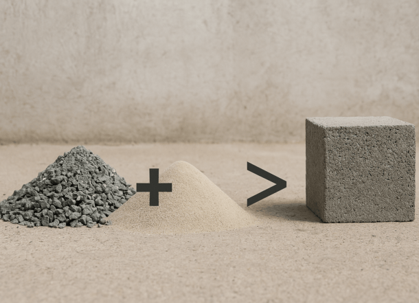 Mucha gente cree que al juntar 1 metro cúbico de grava con 1 metro cúbico de arena y un poco de cemento y agua, tendrá 2 o incluso 3 metros cúbicos de concreto al final. Pero no es así como funciona.