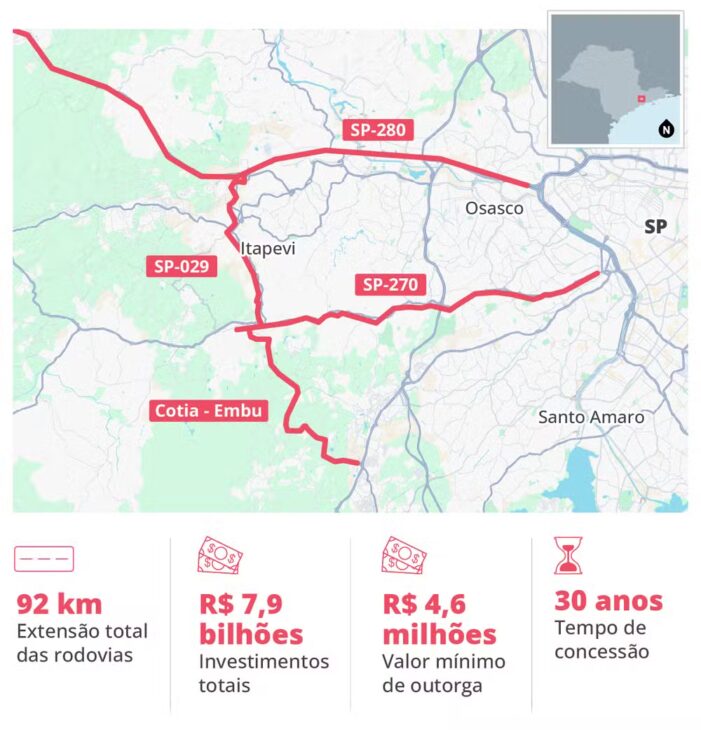 La concesión abarca las rutas SP-280, SP-270 y SP-029, incluyendo el tramo municipal entre Cotia y Embu das Artes. La inversión total prevista es de R$ 7,9 mil millones, con potencial para generar 8.300 empleos. De este monto, R$ 1,3 mil millones se destinarán a la seguridad vial. A continuación, explicaremos con más detalles las obras que se llevarán a cabo.