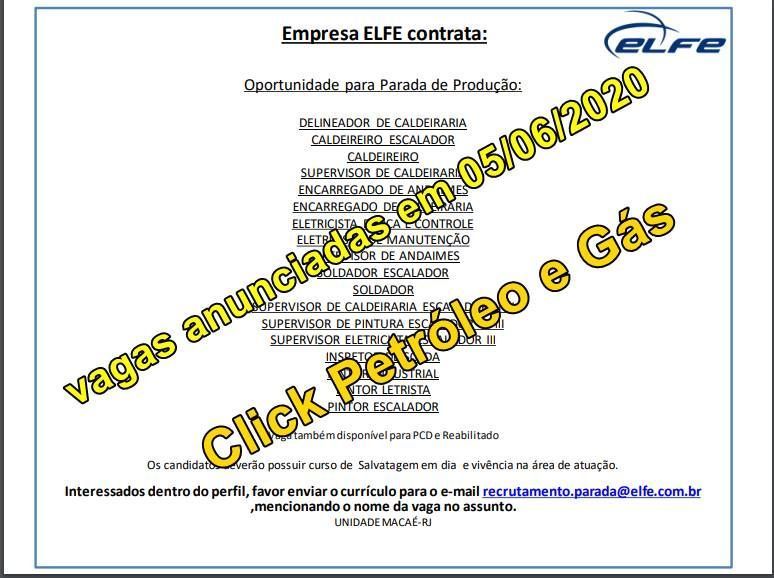 Em meio à crise causada pelo coronavírus, Elfe Engenharia anuncia esta tarde (05/06) muitas vagas offshore para atender contratos em Macaé, confira abaixo todos os cargos e como se candidatar. Multinacional do petróleo inicia processo seletivo offshore URGENTE com cadastro de currículo para Técnico em Elétrica e Eletrônica
