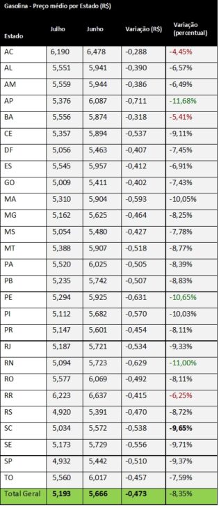 La investigación indicó una mayor reducción en el precio del combustible en Rio Grande do Norte (-11%), cerrando el mes en R$ 5,094 – valor inferior a la media nacional -, Amapá (-11,68%) y Pernambuco (-10,65%). Ningún estado presentó incrementos en los precios, pero las caídas más tímidas fueron verificadas en Acre (-4,45%), Bahía (-5,41%) y Roraima (-6,25%).