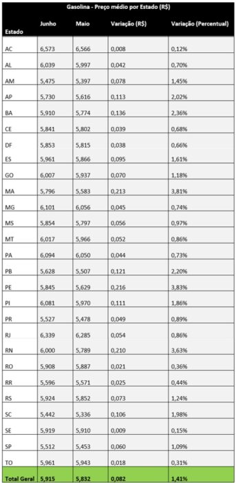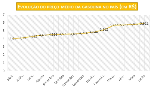 El precio medio de la gasolina registró variación positiva por el 13º mes consecutivo. En junio, el valor subió 1,41% en las estaciones de combustible del país – en promedio, el litro fue vendido a R$ 5,915 (el mes anterior, el precio medio fue de R$ 5,832).