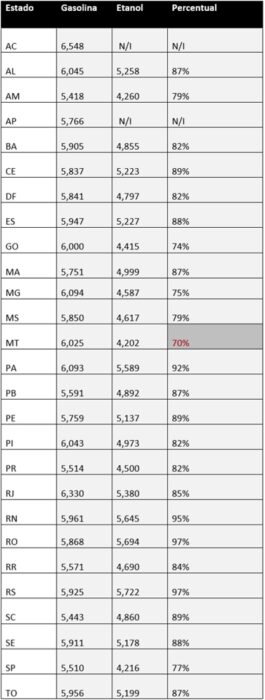 Rio Grande do Sul (R$ 5,722) y Rondônia (R$ 5,694) registraron los mayores precios medios del etanol en junio. Conforme el levantamiento, al igual que ocurrió en mayo, solo en Mato Grosso compensa abastecer el vehículo con etanol – la opción solo es ventajosa cuando el litro del derivado de la caña de azúcar cueste 70% (o menos) que el litro de gasolina.
