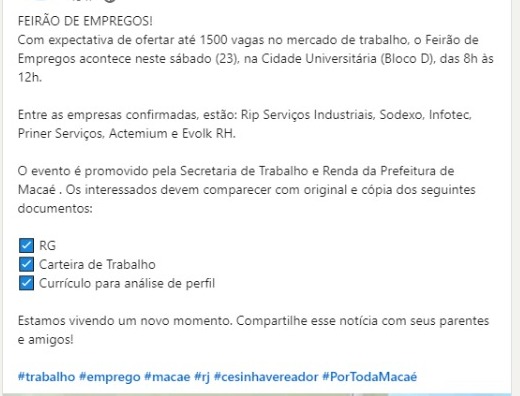 La municipalidad de Macaé anunció una feria con vacantes de empleo generales y offshore este sábado, 23 de julio. Los profesionales interesados en participar deberán asistir a la Ciudad Universitaria con su currículum actualizado y documentos para inscribirse a las oportunidades. El día habrá reclutamiento y selección de profesionales al instante junto a entrevistas de empleo para inicio inmediato, diversas empresas de Recursos Humanos y Offshore deberán participar.