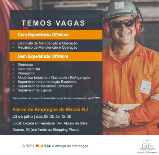 Una de las empresas que formarán parte de la Feria de Empleo en la ciudad de Macaé, ubicada en Rio de Janeiro (RJ), es RIP Servicios Industriales, que tiene diversas oportunidades offshore para candidatos sin experiencia.