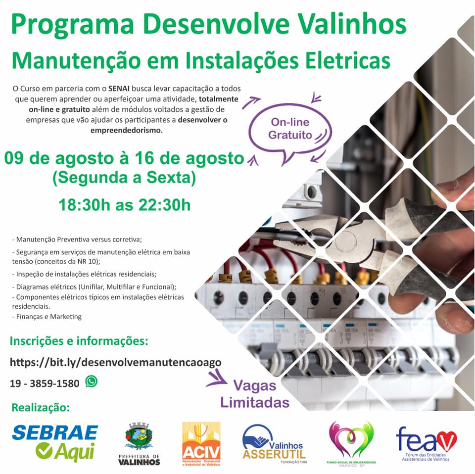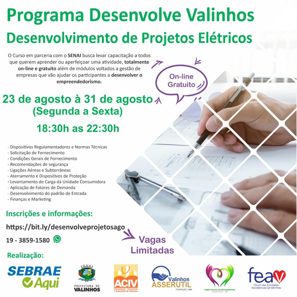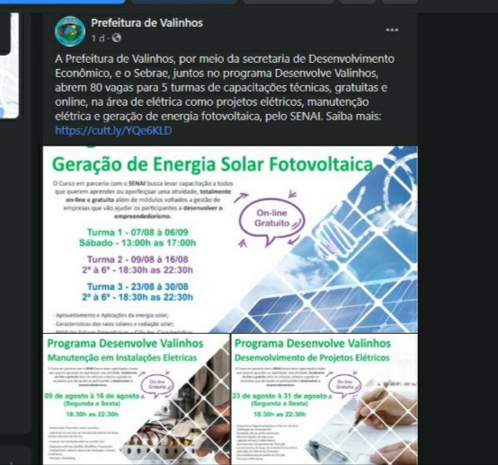 La prefeitura de Valinhos – SP se pronunció respecto a los cursos gratuitos en línea y EAD ofrecidos en asociación con el Senai, afirmando: «La Prefeitura de Valinhos, a través de la secretaría de Desarrollo Económico, y el Sebrae, juntos en el programa Desenvolve Valinhos, abren 80 vacantes para 5 grupos de capacitación técnica, gratuitas y en línea, en el área eléctrica como proyectos eléctricos, mantenimiento eléctrico y generación de energía fotovoltaica, por el SENAI». Consulte las imágenes: