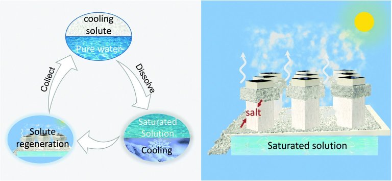 «La sal cristalizada puede ser recogida automáticamente ya que la sal cae debido a la gravedad,» dijo Wenbin. Después de ser recogida, la sal representa efectivamente una forma almacenada de energía solar, lista para ser reutilizada para enfriamiento nuevamente, cuando sea necesario en la nevera solar o aire acondicionado.