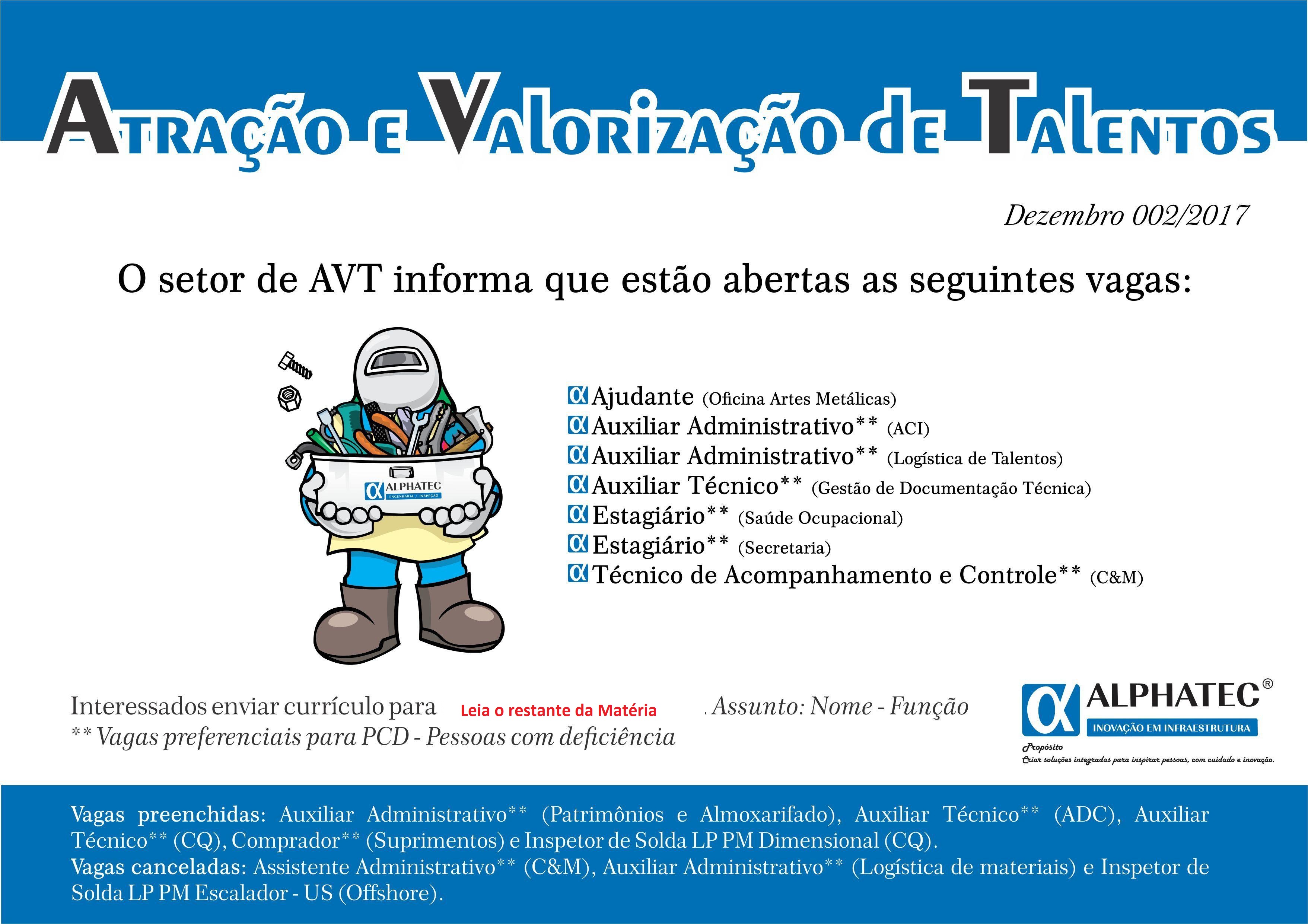 Las empresas que acaban de abrir estas vacantes son Alphatec( empresa 1) y CSE Mecánica e Instrumentación( empresa 2). Envíen sus currículos a los correos electrónicos avt@alphatec.ind.br y recrutamento@csemil.com, es importante mencionar en el mensaje si ya han sido empleados de las empresas. Observaciones: Muchos se quejan de que los correos electrónicos están rebotando y otros ya logran enviar sin problemas. Esto ocurre por prácticas de Spam! Enviar correos electrónicos sin tener las calificaciones para el puesto causa el bloqueo de su contacto. No sirve de nada enviar correos electrónicos para vacantes a las que no tienen las atribuciones, solo se perjudican por eso.