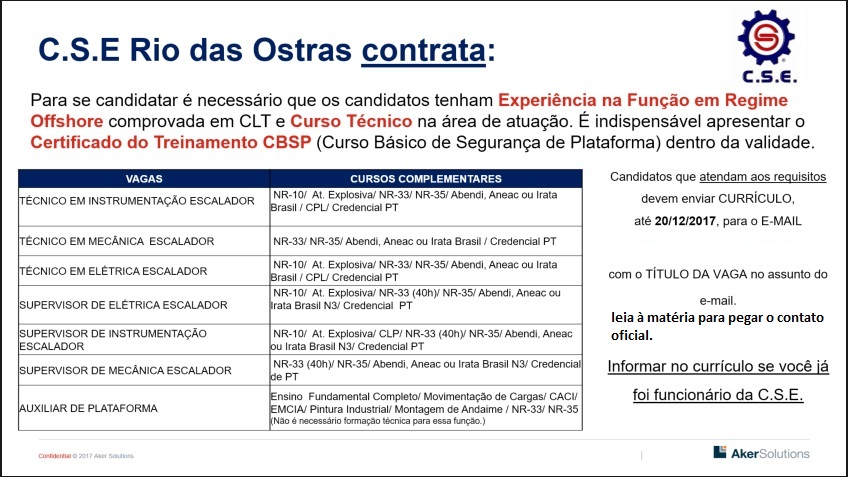 [supsystic-social-sharing id=’1′]El sector offshore, petróleo y gas finalmente está engranado y motivado a retomar la economía después de los recientes negocios cerrados en territorio brasileño, con esto, las empresas ahora tienen la garantía de obras por más de 40 años como mínimo, especialmente en la ciudad de Macaé, que volvió a ser el foco de las grandes empresas mundiales después de que el presidente de Petrobras visitara la ciudad el pasado día 12, [vean la materia]. Bueno, para comprobar la consolidación de la posición estratégica de la ciudad en este segmento, dos empresas tradicionales de la ciudad acaban de abrir un gran proceso selectivo, revisen las oportunidades disponibles: