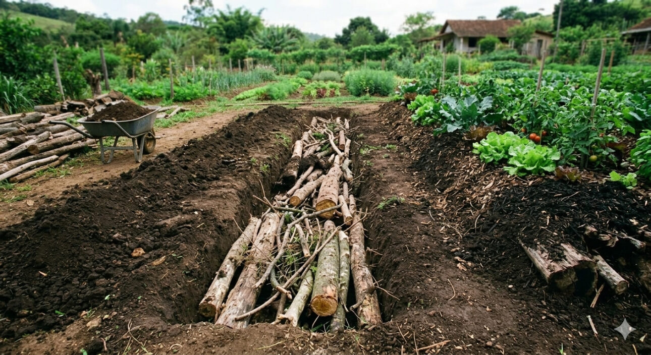 Enterrar troncos y ramas bajo canteros crea una “esponja subterránea” que retiene agua y nutrientes en el suelo, reduciendo riego y aumentando la fertilidad de la huerta.
