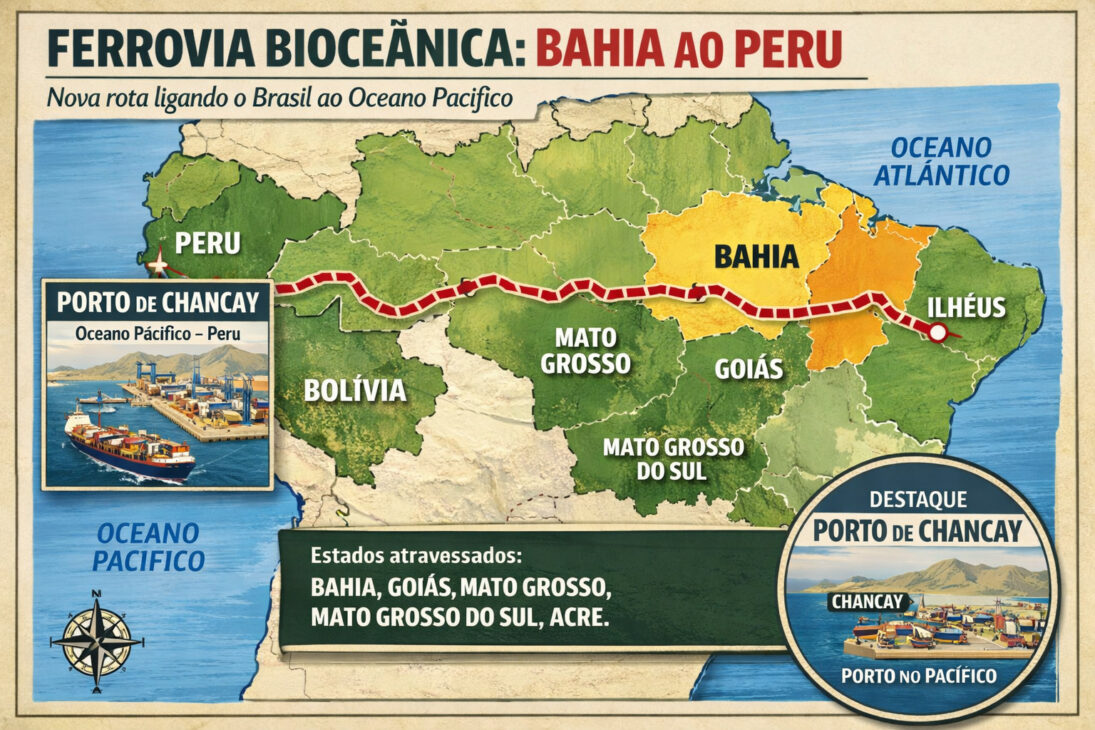 Brasil y China negocian la construcción de una ferrovia bioceánica que promete redesenhar la logística de América del Sur. Actualmente, el proyecto prevé la conexión del puerto de Ilhéus, en el sur de Bahia, al puerto de Chancay, en Perú. Con esto, el corredor ferroviario conectaría el Atlántico al Pacífico, con apoyo financiero chino y enfoque directo en la exportación de commodities brasileñas al mercado asiático.