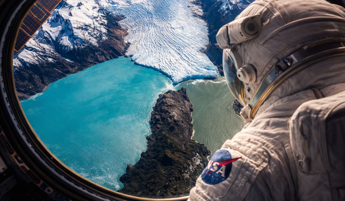 Visto desde el espacio, una imagen tomada por un astronauta muestra en la Patagonia argentina el punto exacto donde un glaciar colosal, un lago azul-turquesa y un brazo de agua verdosa se tocan, creando uno de los paisajes más raros e impresionantes de la región.