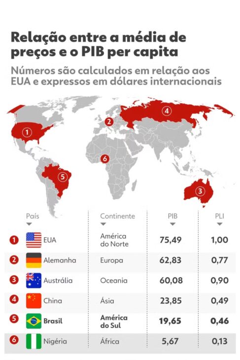 El PLI muestra que Brasil tiene precios promedio más altos que el 52 por ciento de las 192 naciones evaluadas. En teoría, los países ricos suelen tener precios más altos, pero Brasil destaca como un caso atípico. A pesar de tener ingresos más bajos, el país tiene precios que superan los de economías más desarrolladas.