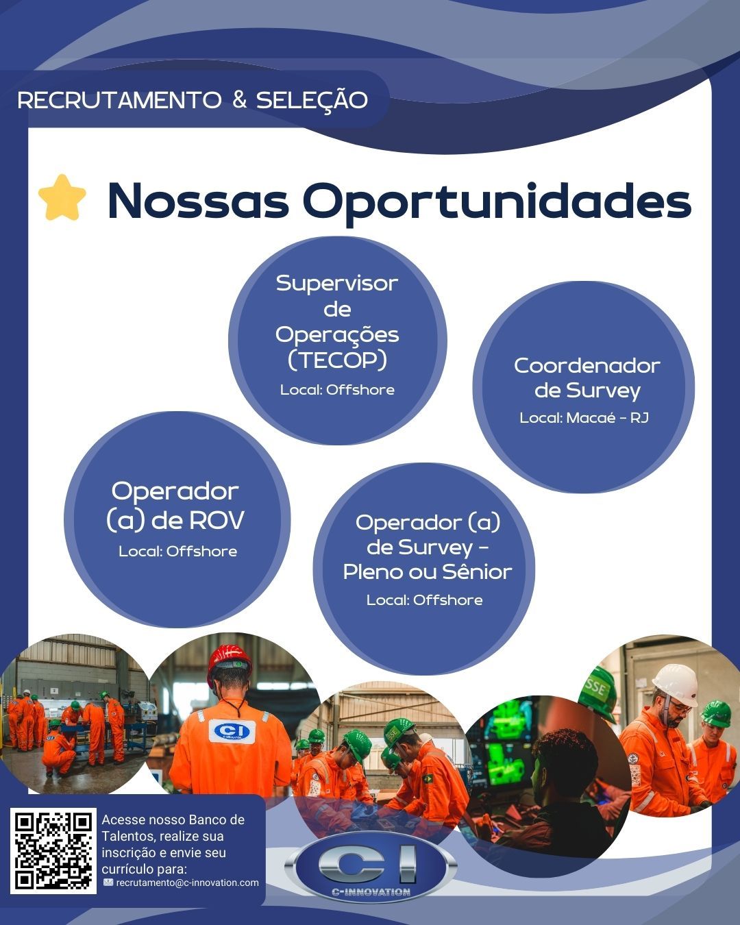 A C-Innovation, empresa referente en el sector de robótica submarina y servicios offshore, tiene nuevas oportunidades abiertas para profesionales que desean participar en proyectos desafiantes en el mar y en tierra. Las vacantes contemplan posiciones para Supervisor de Operaciones (TECOP), Operador(a) de ROV, Operador(a) de Survey Pleno o Sénior, y Coordinador de Survey — este último ubicado en Macaé (RJ).