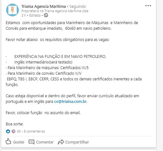 La empresa informa a los profesionales interesados en las vacantes, con disponibilidad para embarcar en escala 60 x 60 y que cumplan con todos los requisitos anteriores, envíen el currículum actualizado en portugués y en inglés por correo electrónico informando la función en el campo asunto a: cv@triaina.com.br.