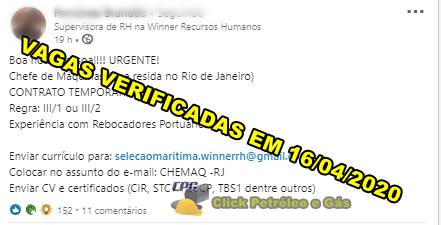 La empresa de recursos humanos Winner RH anunció ayer (16) nueva oportunidad de trabajo para marítimo residente en Río de Janeiro para postularse al cargo de Jefe de Máquinas para embarque INMEDIATO en actividades de petróleo y gas. Soldador, Mecánico, Calderero y Técnico requeridos para vacantes en parada de mantenimiento en minera; inicio el 19 de mayo