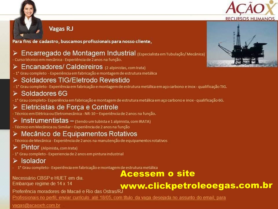 Necesario CBSP y HUET Embarque 14×14, preferencia para residentes de Macaé y Río das Ostras. Enviar currículum con el título del puesto en el asunto hasta el día 18/05/18 al correo electrónico: vagas@acaoxrh.com.br. Después de enviar sus CV’s, recibirán los siguientes mensajes en su correo en un plazo de 5 minutos: