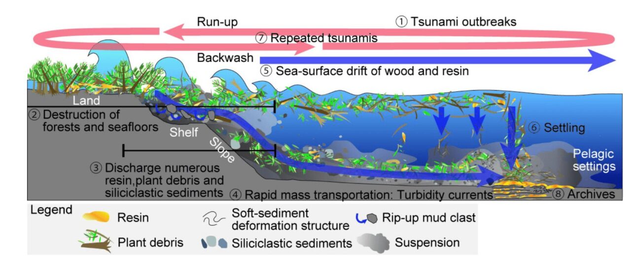 Este avanzó del mar hacia la tierra, arrasando bosques costeros, arrancando árboles y cargando la resina de las plantas. Al mismo tiempo, plataformas costeras colapsaron, lanzando sedimentos y caliza al fondo del océano.