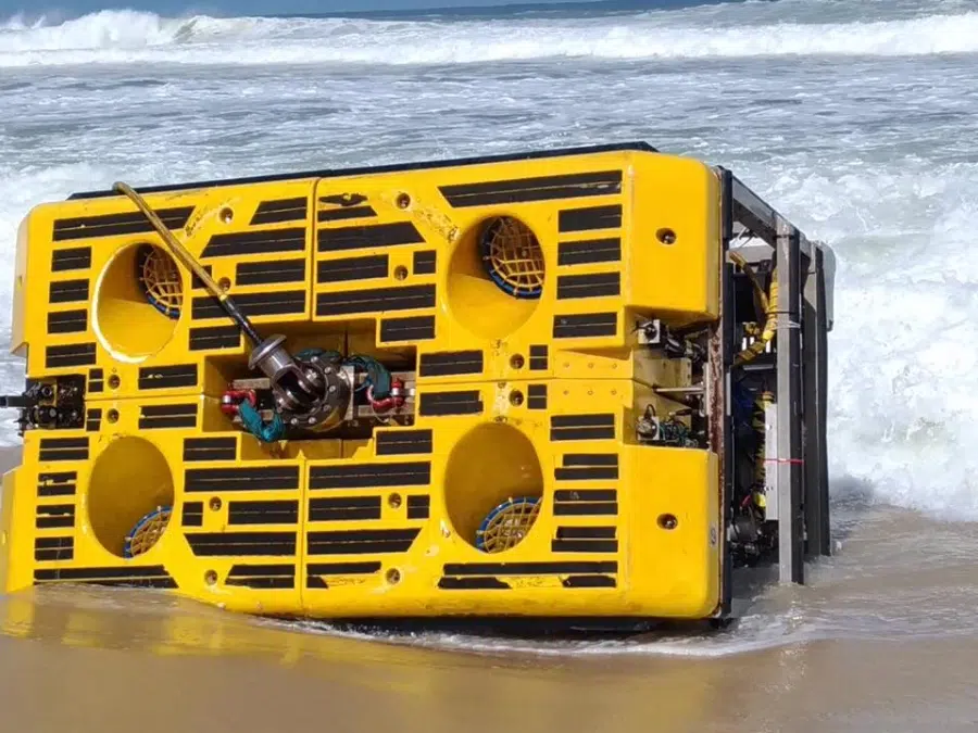 Un robot submarino, conocido como ROV, equipo que es operado remotamente, fue arrastrado por la fuerza de la resaca hasta la Playa de Barra Nova, en Saquarema, Río de Janeiro.